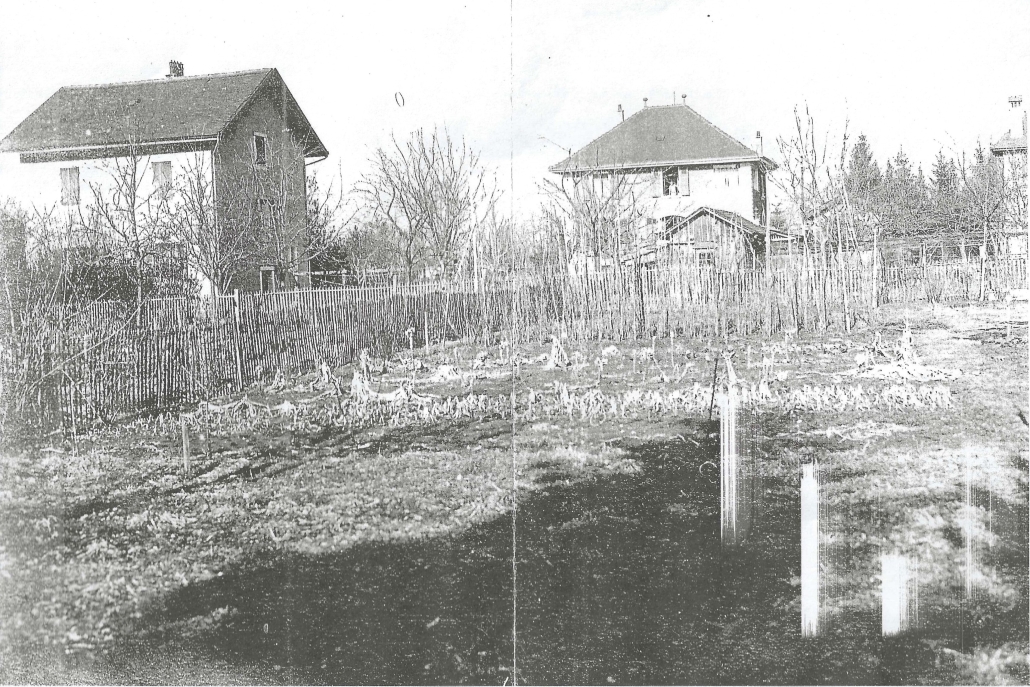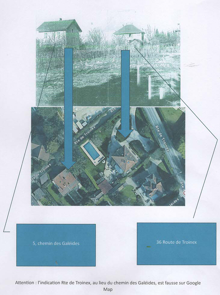 Photo (auteur inconnu) de deux maisons au 5 Galéides (à gauche) et 36 Rte de Troinex (au centre)