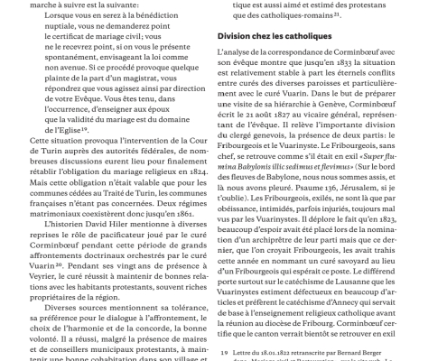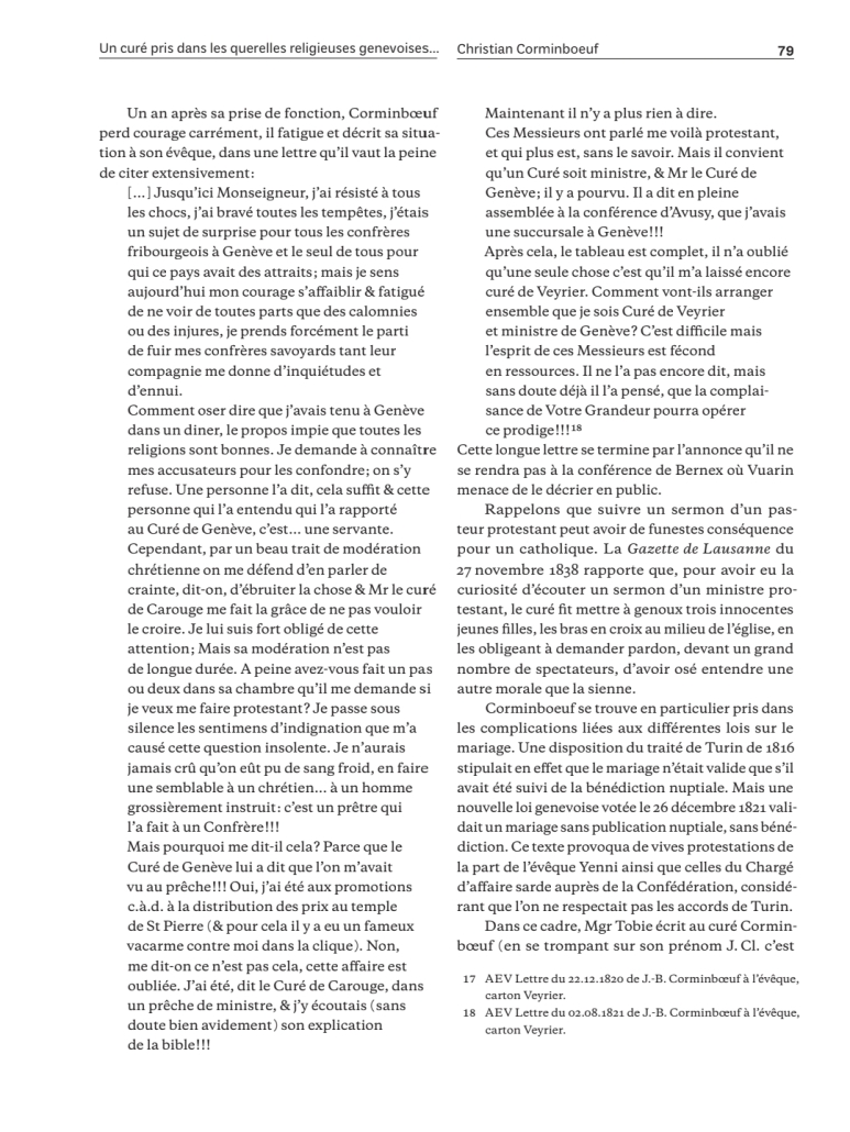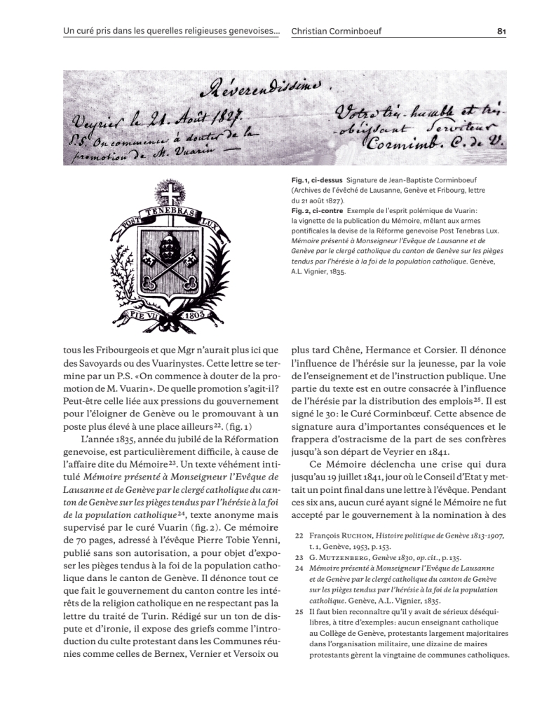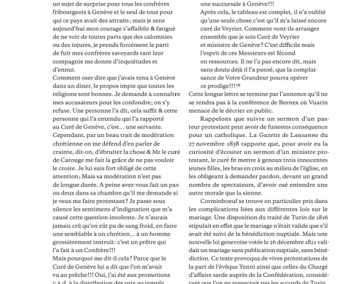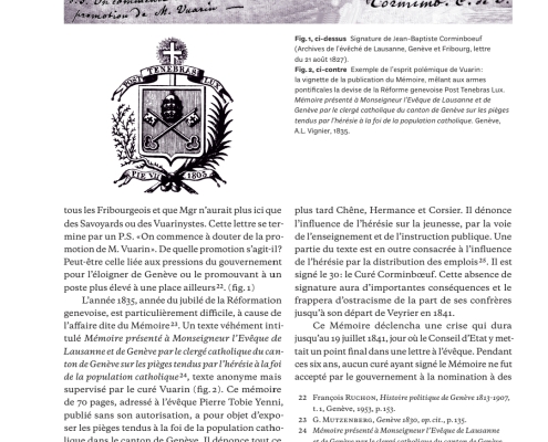 L’année 1836 est particulièrement difficile à cause de l’affaire dite du Mémoire. Un texte véhément intitulé « Mémoire présenté à Monseigneur l’Evêque de Lausanne et de Genève par le clergé catholique du canton de Genève sur les pièges tendus par l’hérésie à la foi de la population catholique », texte anonyme mais supervisé par le curé Vuarin, est signé par tous les curés des paroisses genevoises sauf par le curé Corminboeuf !