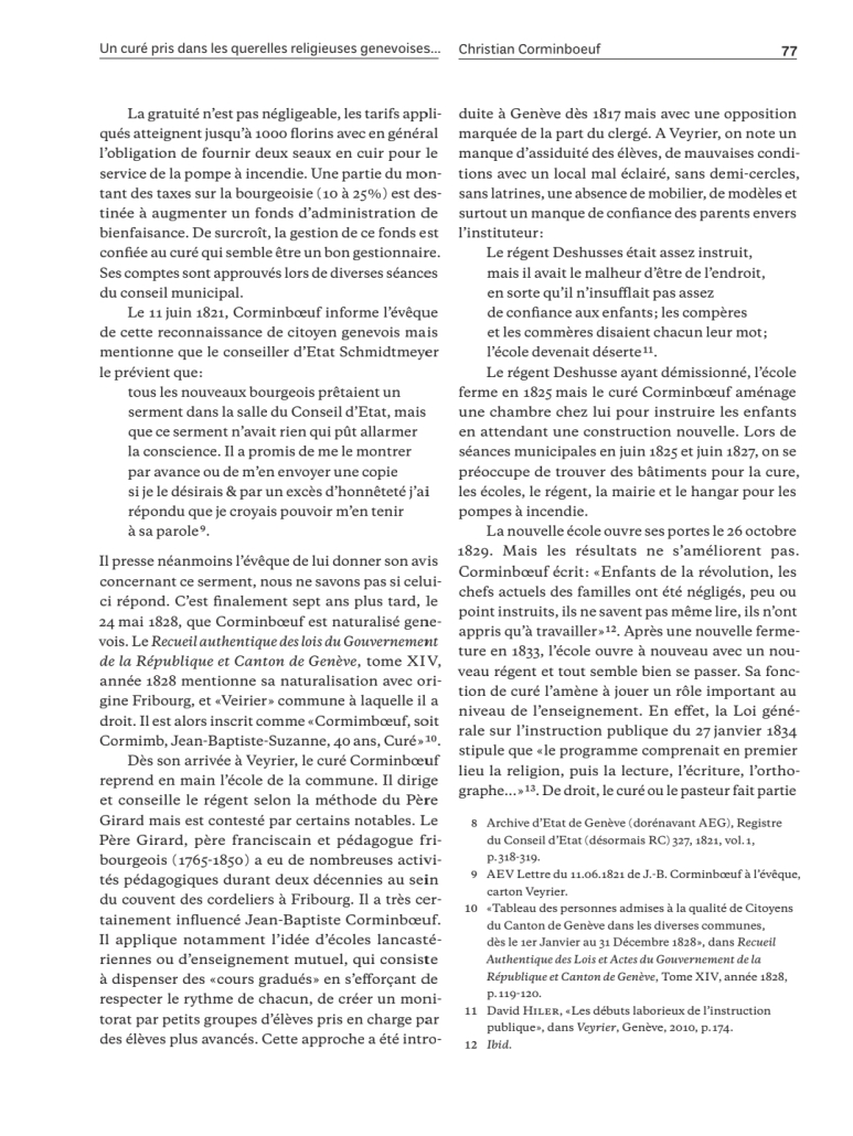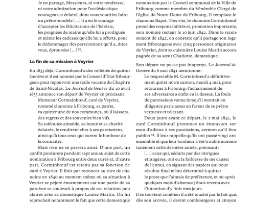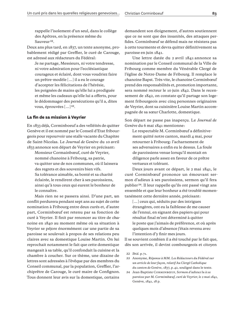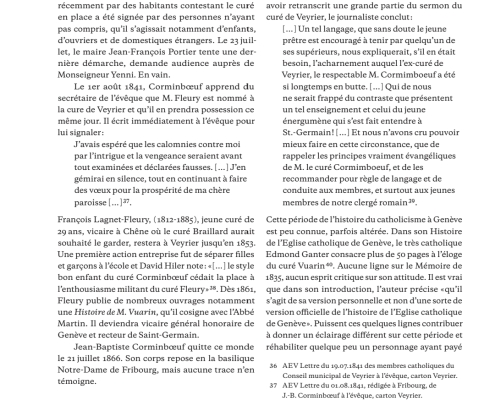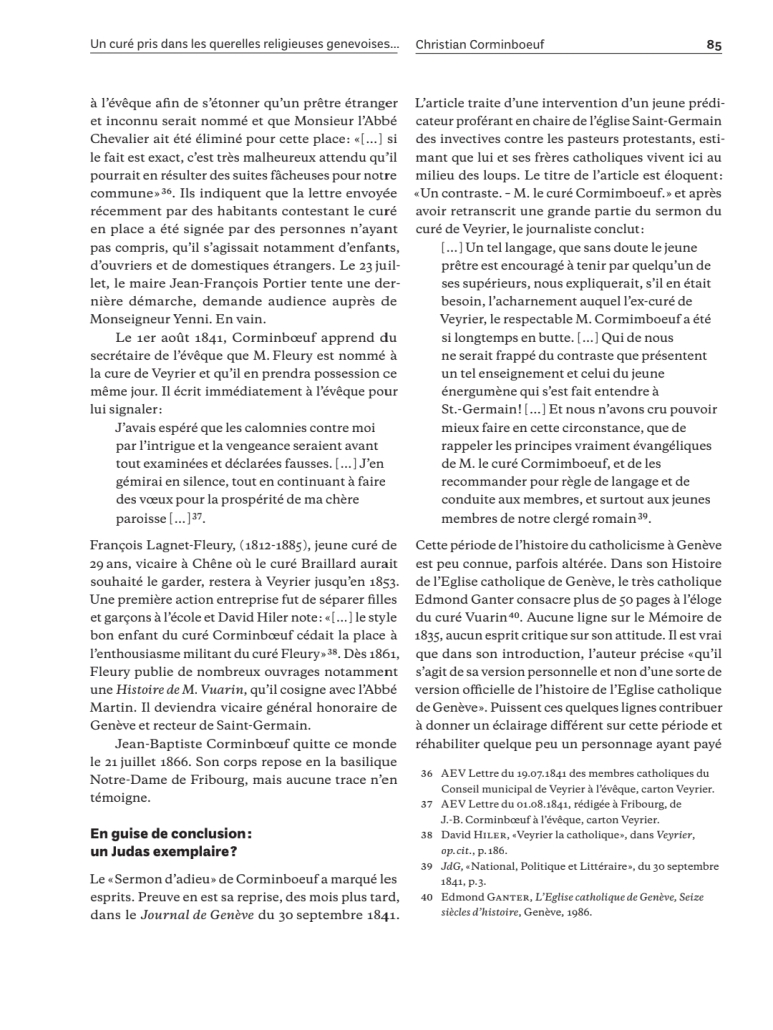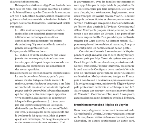 En juin 1841, le curé Corminboeuf quittera Veyrier pour devenir un membre du Vénérable Clergé de l’église de Notre-Dame de Fribourg laissant derrière lui une église rénovée, une école en bon état de marche et des relations apaisées entre protestants et catholiques veyrites. Le curé Fleury lui succédera.